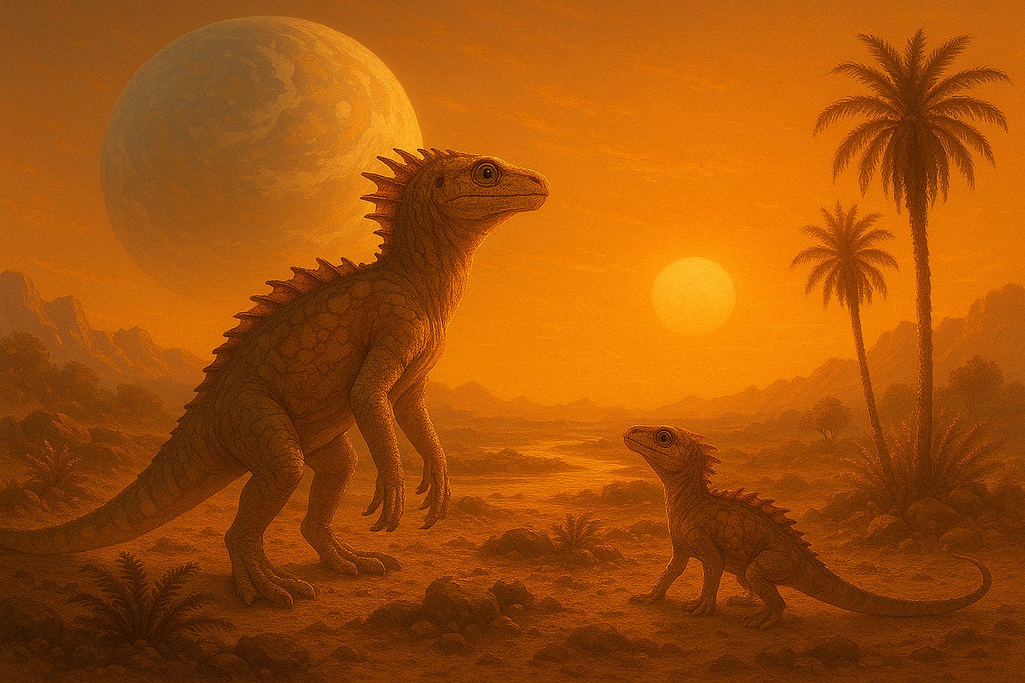 These alien animals are reptilian analogs — meaning they're similar in form to some Earth dinosaurs but evolved under very different conditions. On a high-gravity world like Kepler-442b (estimated to be 40% more massive than Earth), creatures might develop thick limbs, low center of gravity, and dense musculature to move efficiently. Their scales and spines might serve both for thermoregulation and species signaling.