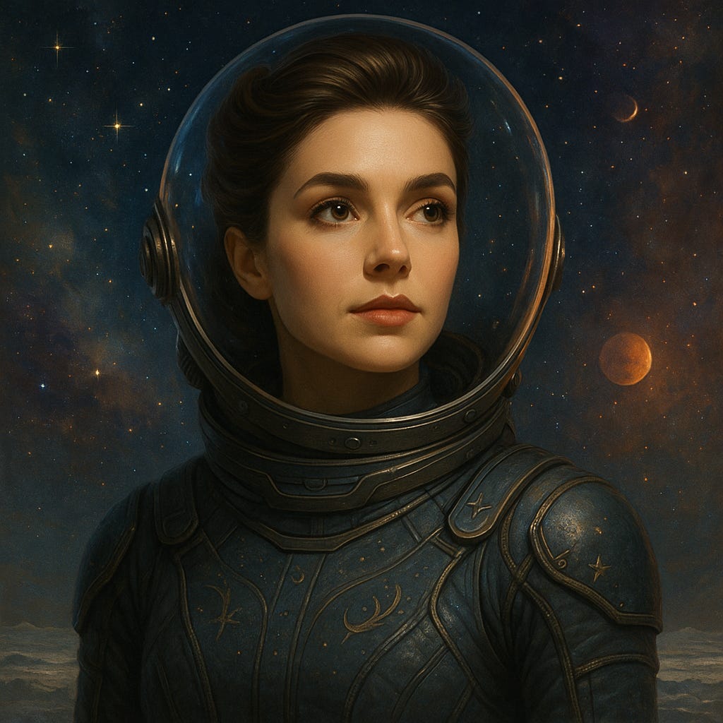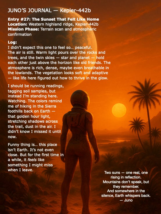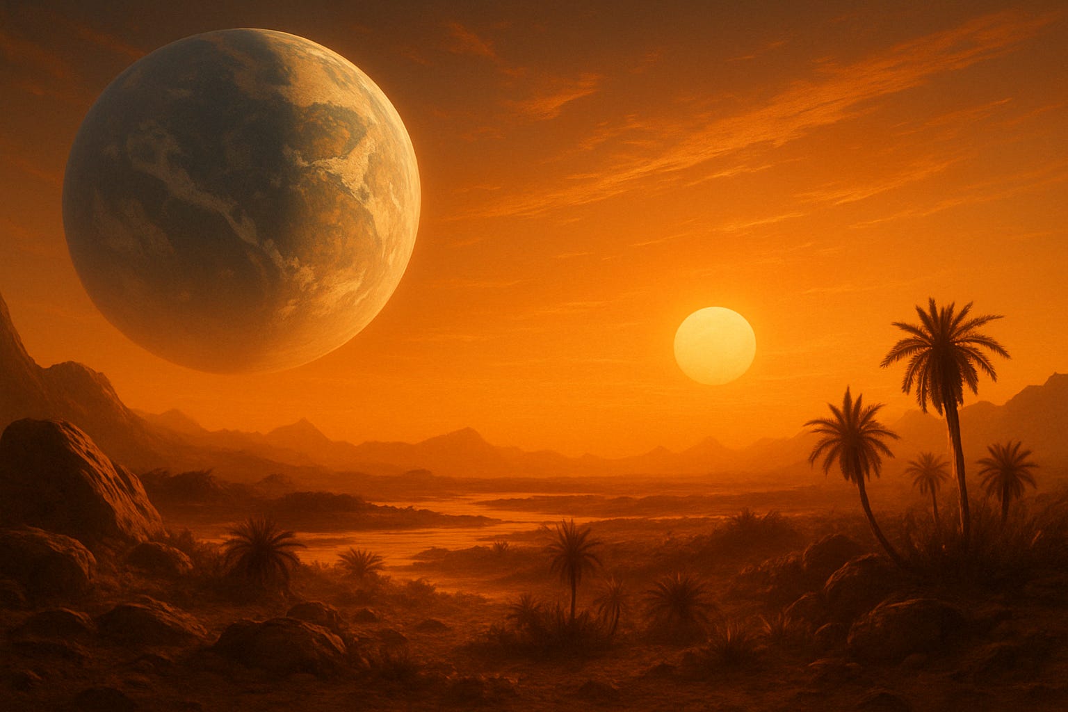 Overhead looms a massive Earth-like world, filling the sky like a moon on steroids, and beyond that, the soft glow of the K-type star, slightly cooler and dimmer than our Sun but still powerful enough to support life.